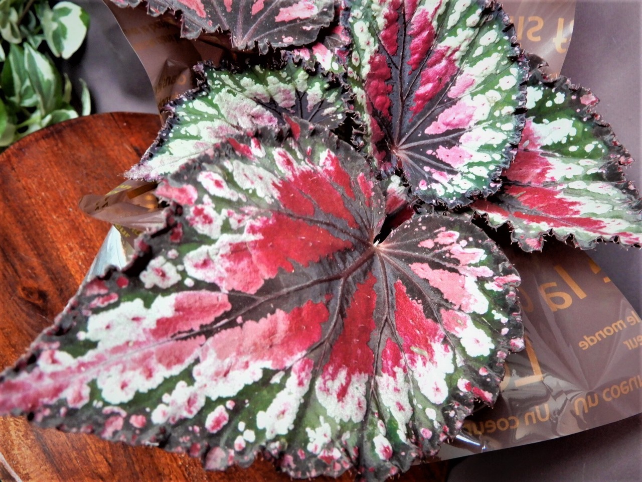 葉を鑑賞するベゴニアで表面はキラキラとし独特の美しさがあります。濃緑 ・ 赤 ・ 桃 ・ 銀白色と、さまざまな色彩の変化がランダムに模様を作っています。