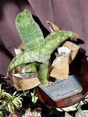 まだらの銀白色が入り肉厚・幅広のどっしりした存在感のある反ってくる葉は
