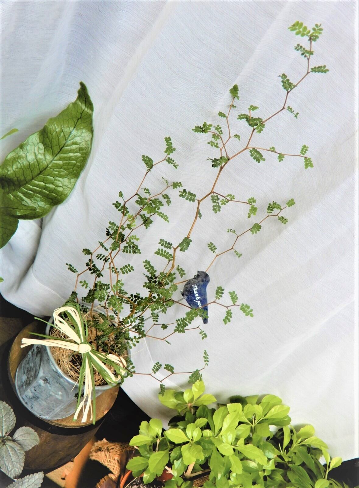 ★メルヘンの木★ ”ソフォラ・リトルベイビー” ☆ブリキ鉢カバー鳥ピックのセット ☆ 観葉植物