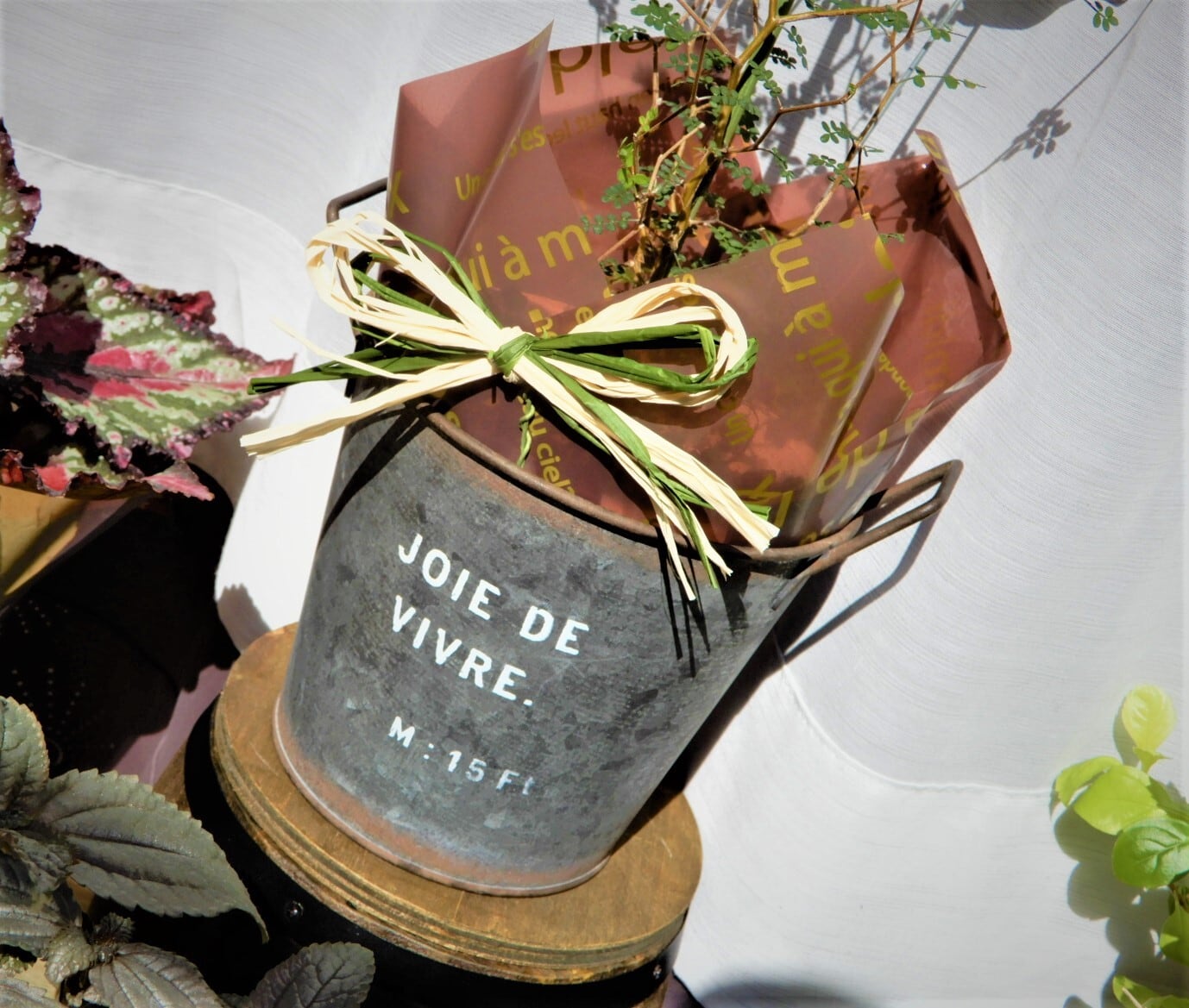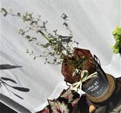 メルヘンの木と足元に少しプミラ・天使のいたずらの小さい葉っぱどうしのグリーンを植え込みにした鉢カバーとピックのセットになります。