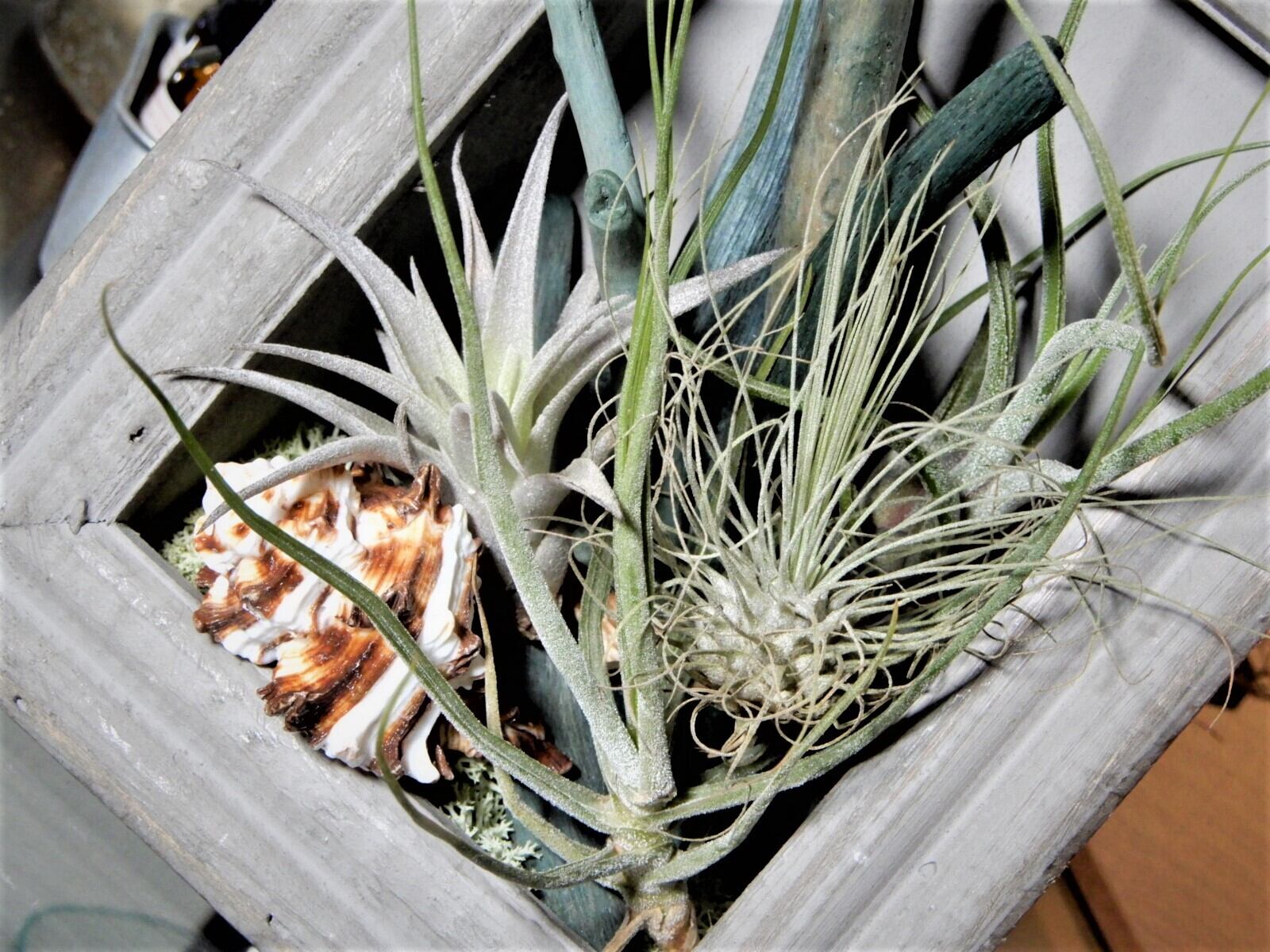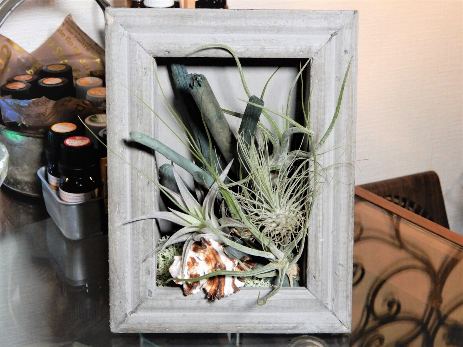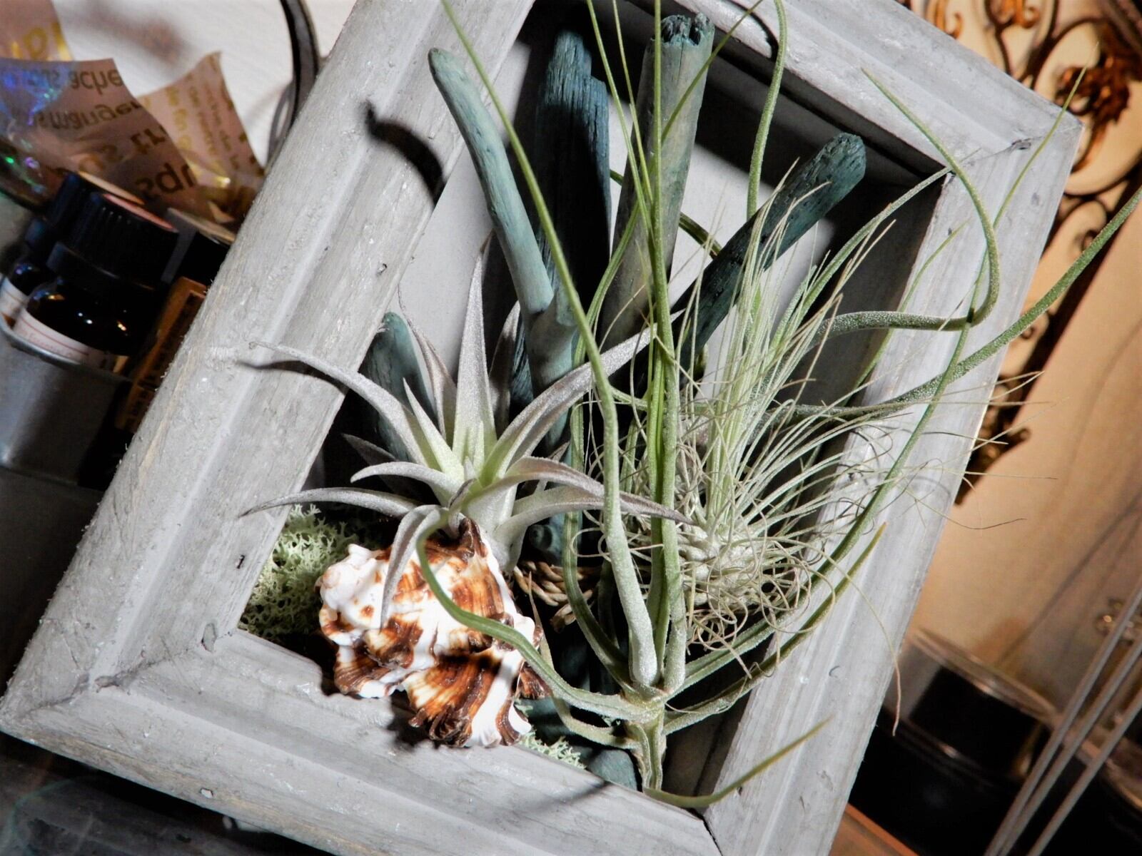 グレイッシュなウッドフレームBOXにグリーン染め流木、ロックシェル、アイスランドモスにエアープランツをセットしました。