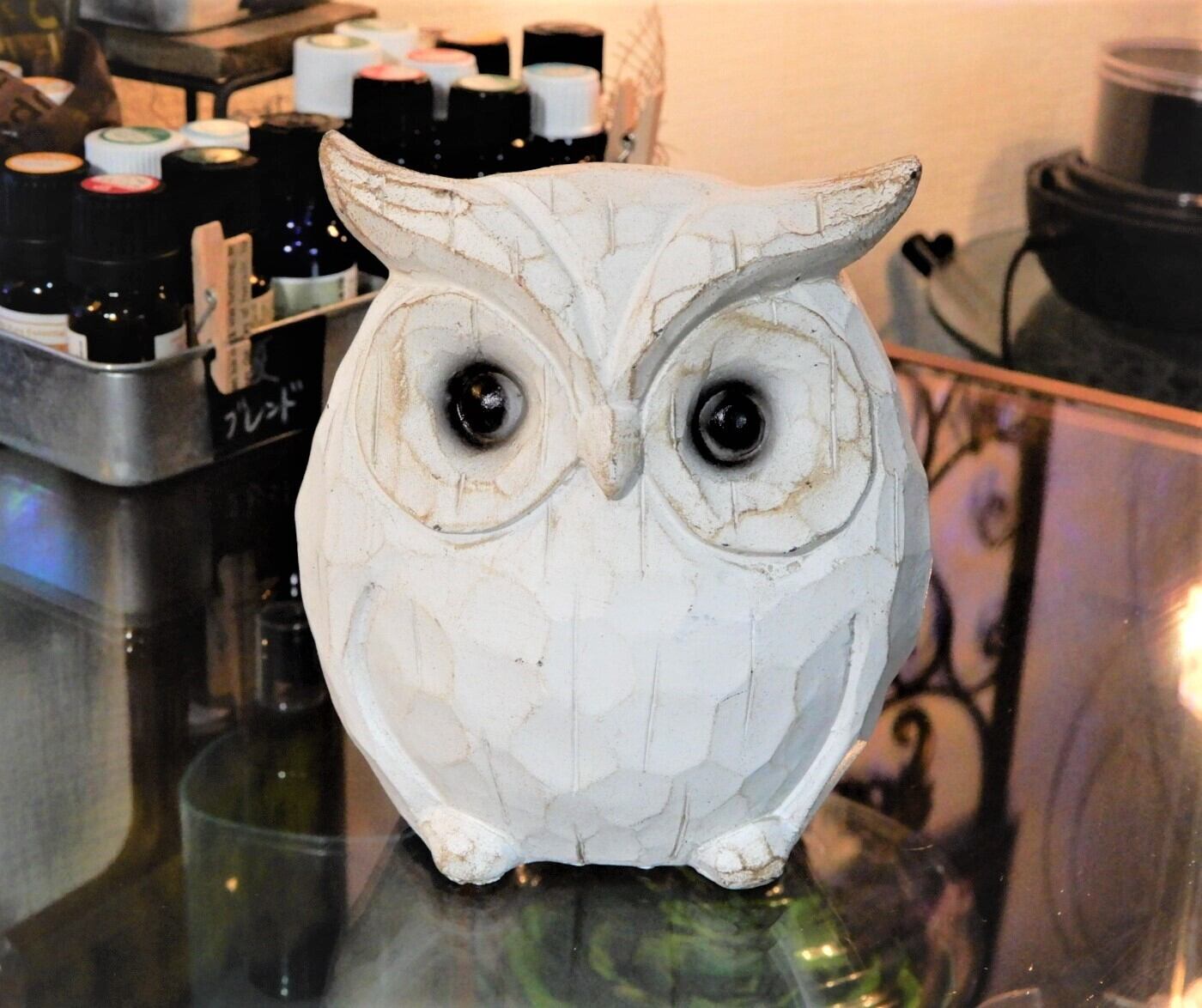 木彫りのフクロウで何となく気になって目がいってしまう可愛さと存在感があります。