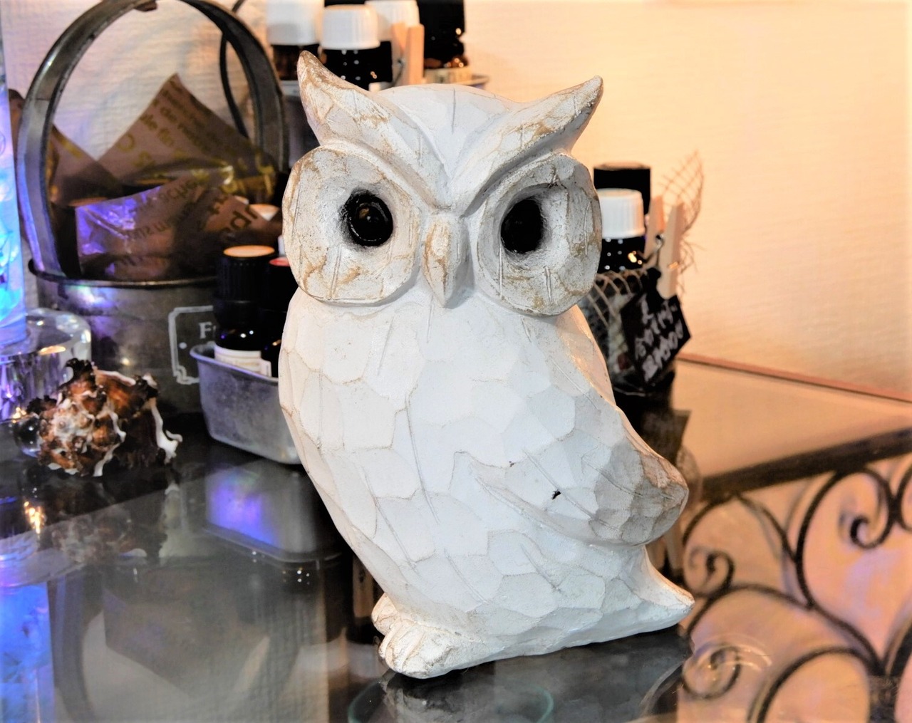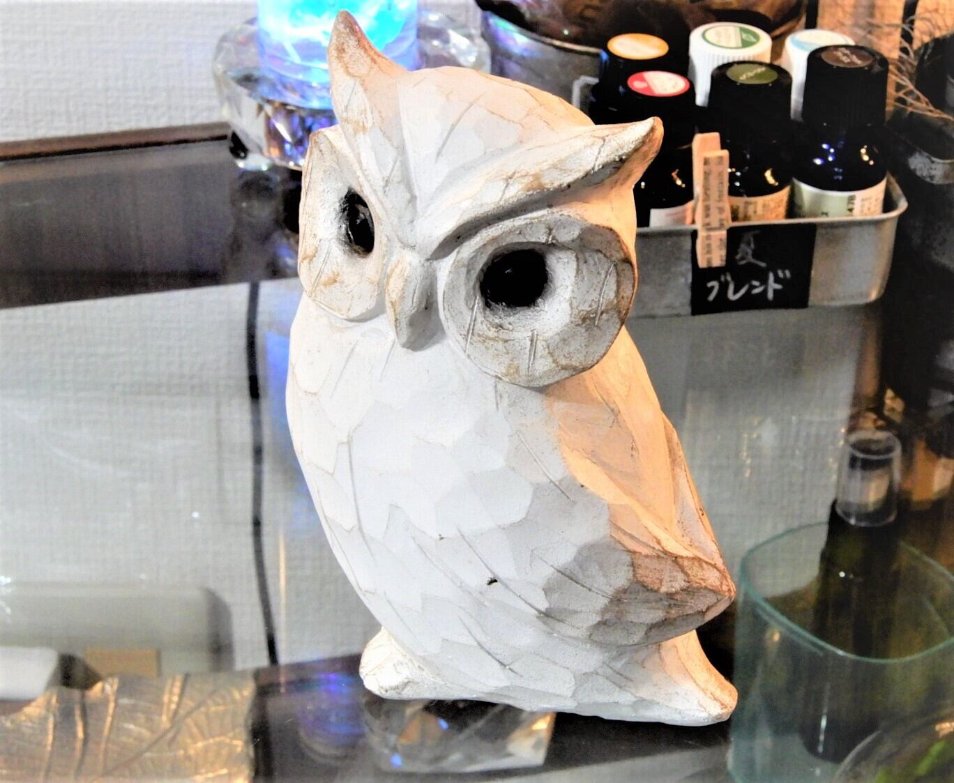 木彫りのフクロウで何となく気になって目がいってしまう可愛さと存在感があります。