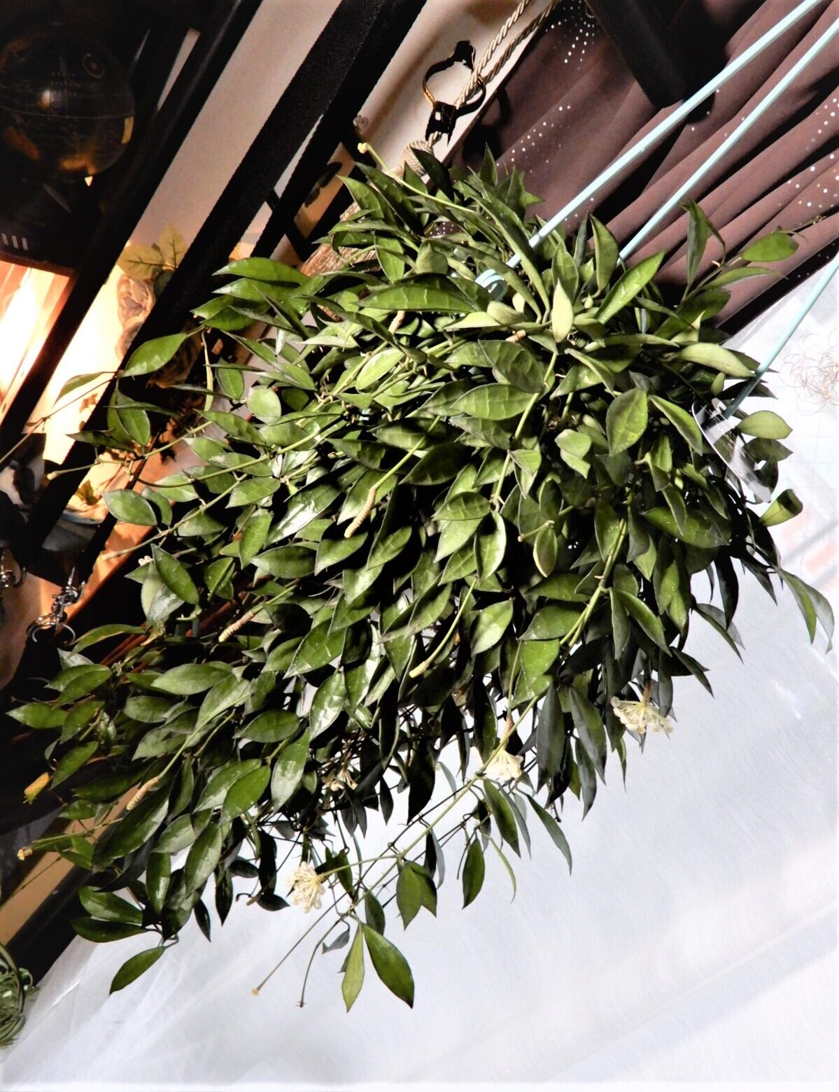 濃い緑の厚みがあり艶のあるアーモンド形の葉が美しく細いツルですらっと垂れ下がっていき繊細な印象を与えます。変わった形の花が密集して咲き甘い芳香があります。花は春から秋にかけて咲き、ラクノーサは花が咲いた後の花柄の先にまた花がつく珍しい品種なので、花柄を摘みとらないようにします。花は下向きに垂れて咲くので高い位置に吊り下から眺めると綺麗です。