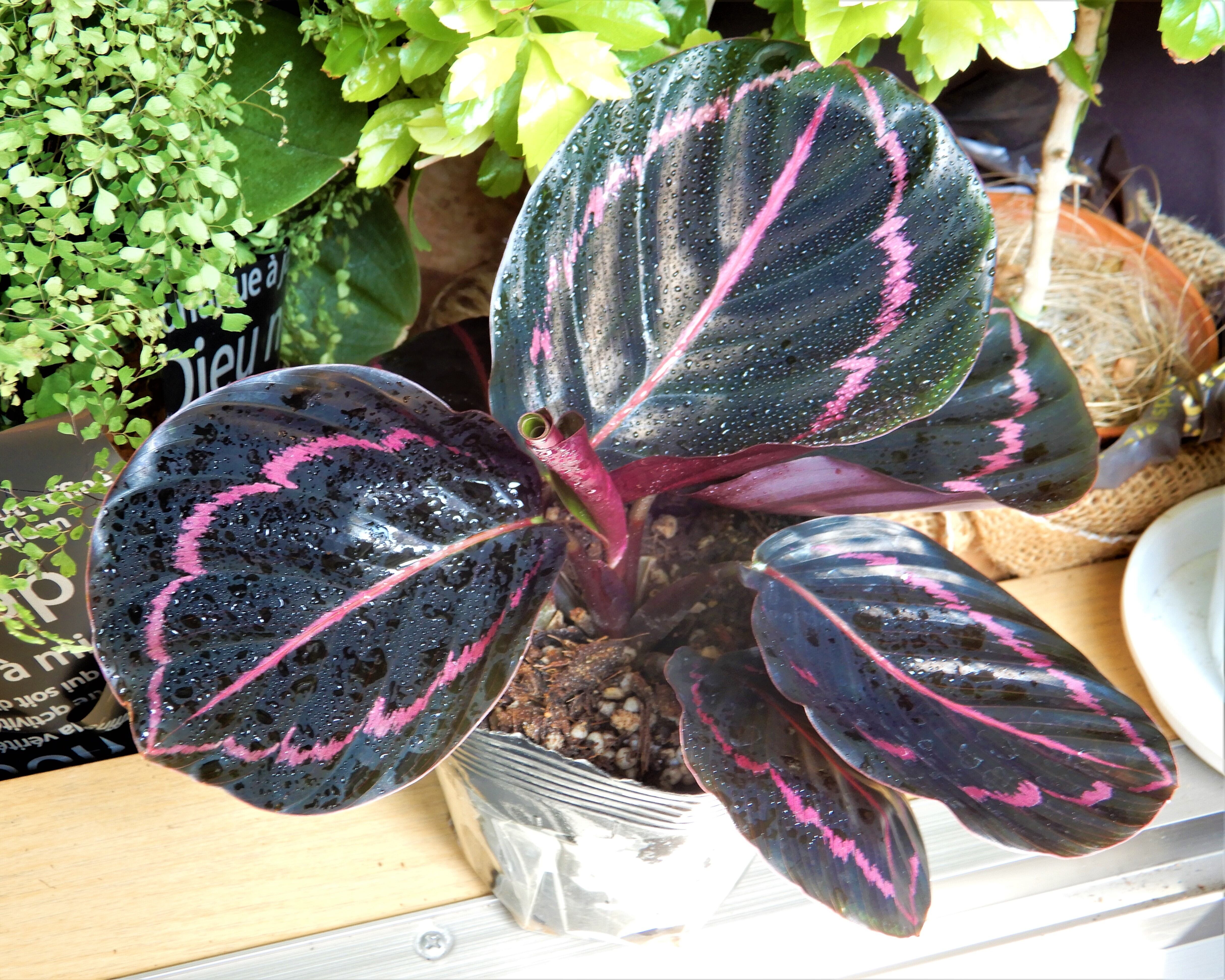 ダークカラーの葉にピンクのラインが綺麗なカラテアです。