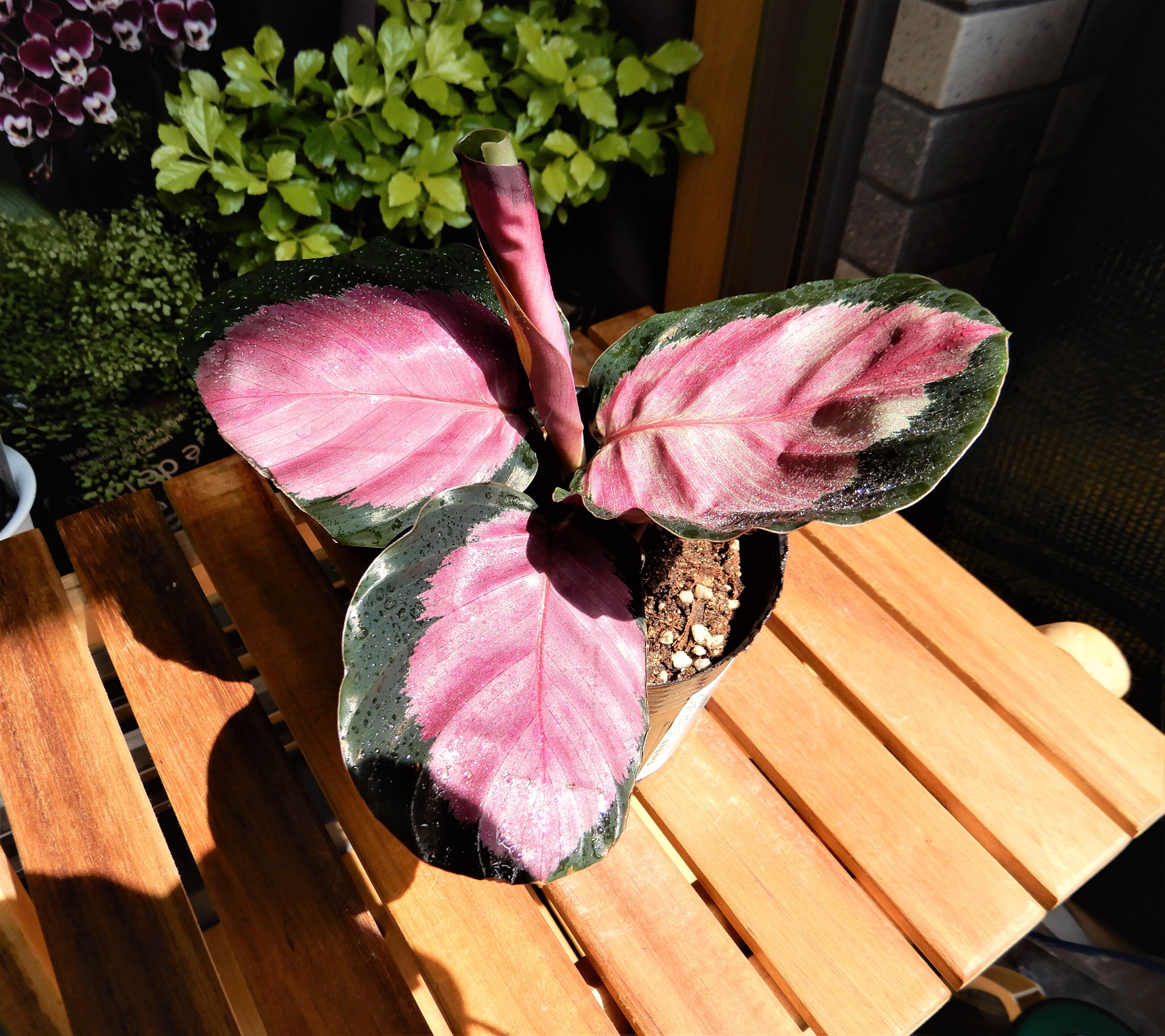 ダークカラーの葉に真ん中にピンクグレーの模様が綺麗なカラテアです。