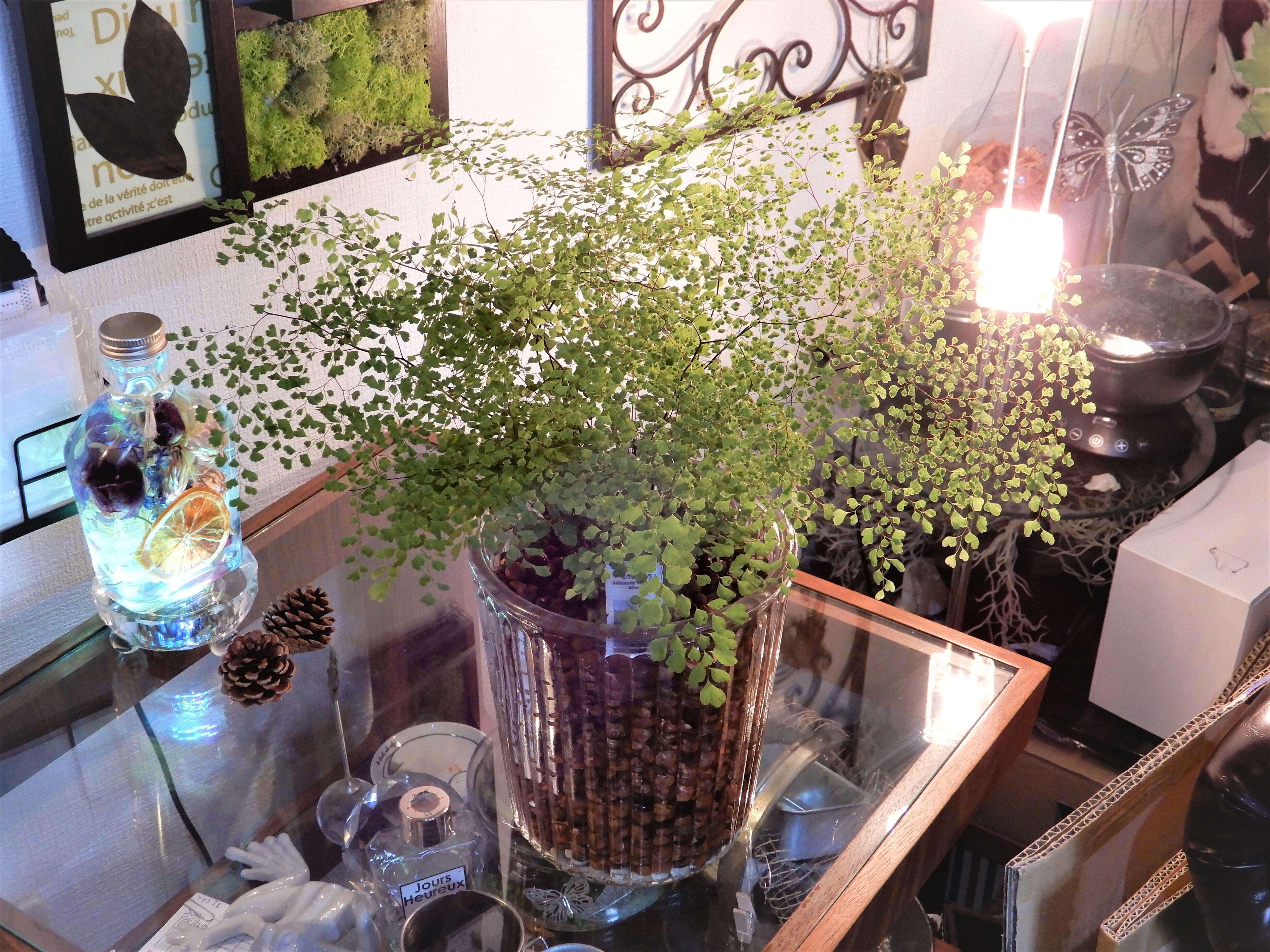 アジアンタムは水切れに弱いのでガラス容器にハイドロボール植えにしました。